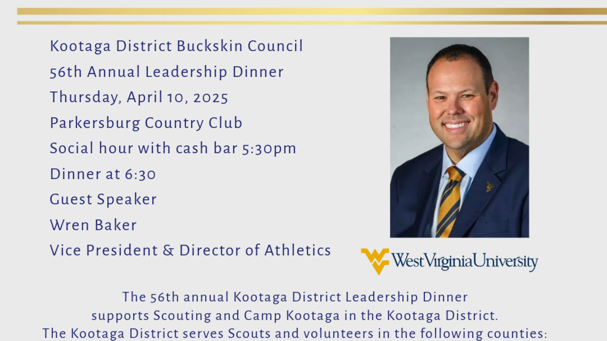 The 56th annual Kootaga District Leadership Dinner supports Scouting and Camp Kootaga in the Kootaga District. The Kootaga District serves Scouts and volunteers in the following counties: Wood, Jackson, Wirt, Roane, Ritchie and Calhoun counties in West Virginia and the communities of Belpre, Little Hocking and Coolville in Ohio. Your donations and support are greatly appreciated.